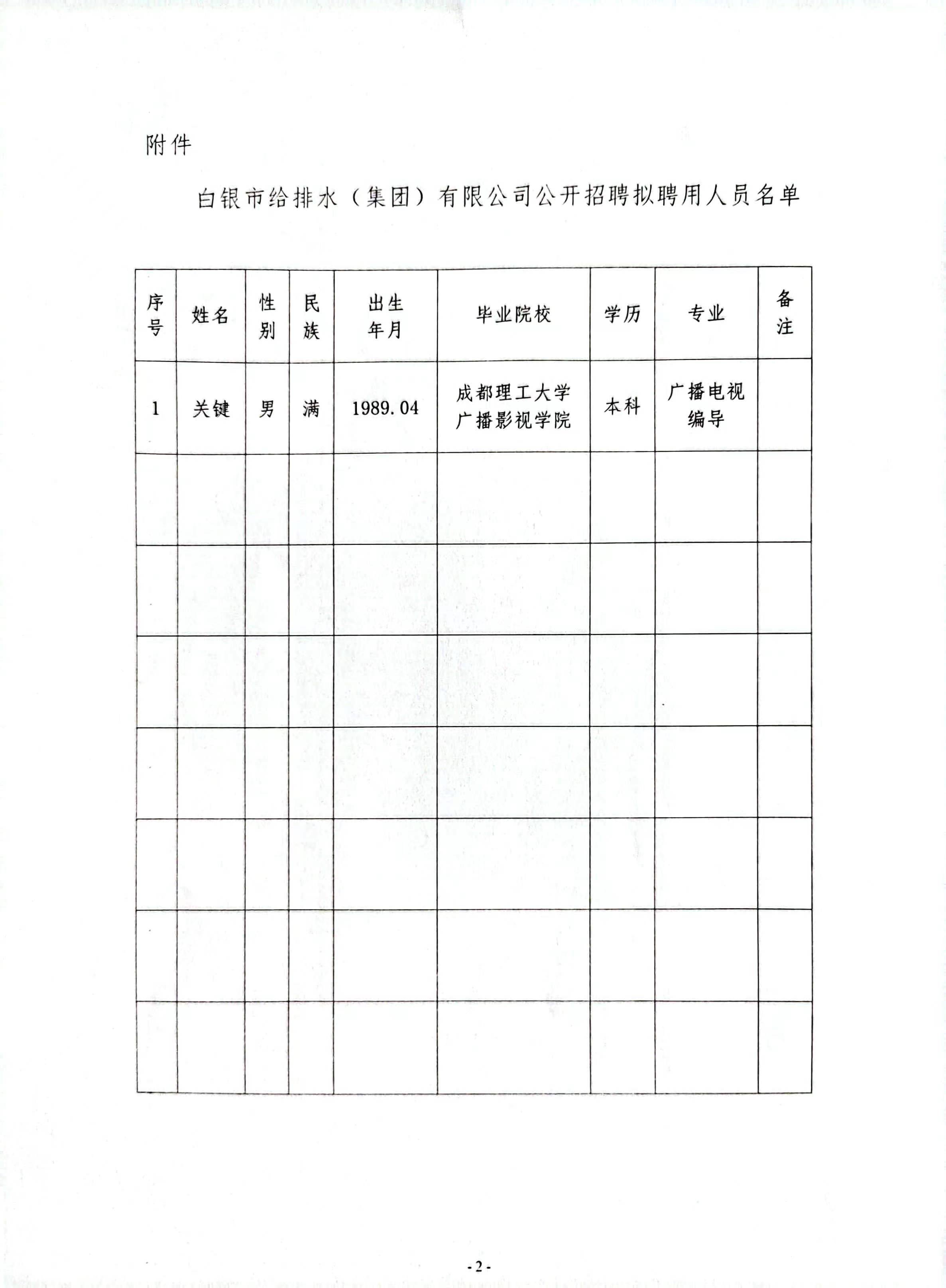 白銀市給排水(集團)有限公司2025年公開招聘擬聘用人員的公示